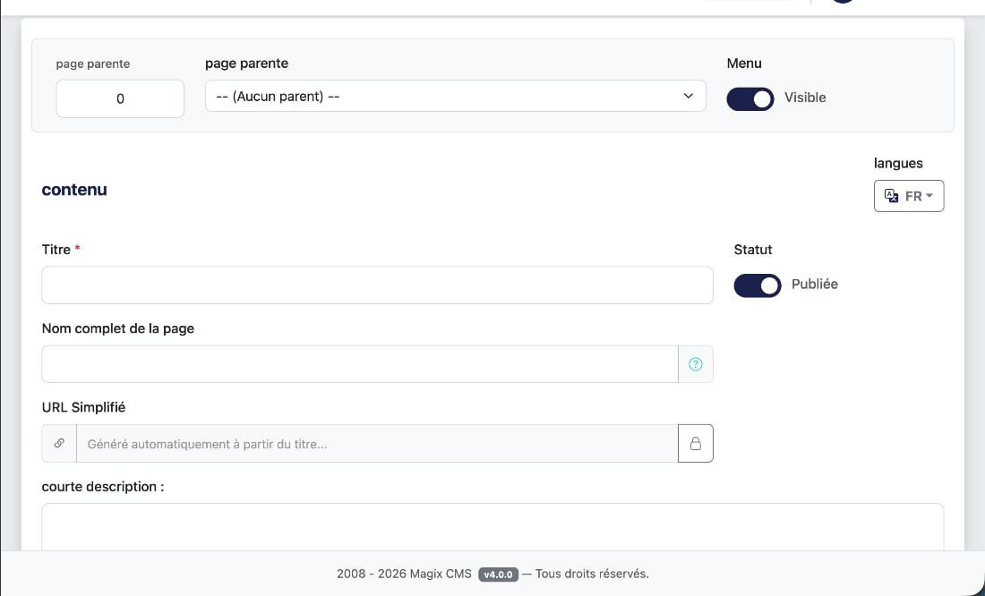 Édition de l'URL (Slug) : Magix CMS 4 génère automatiquement une URL propre. Vous pouvez toutefois la modifier manuellement pour la rendre plus courte ou plus pertinente (ex: