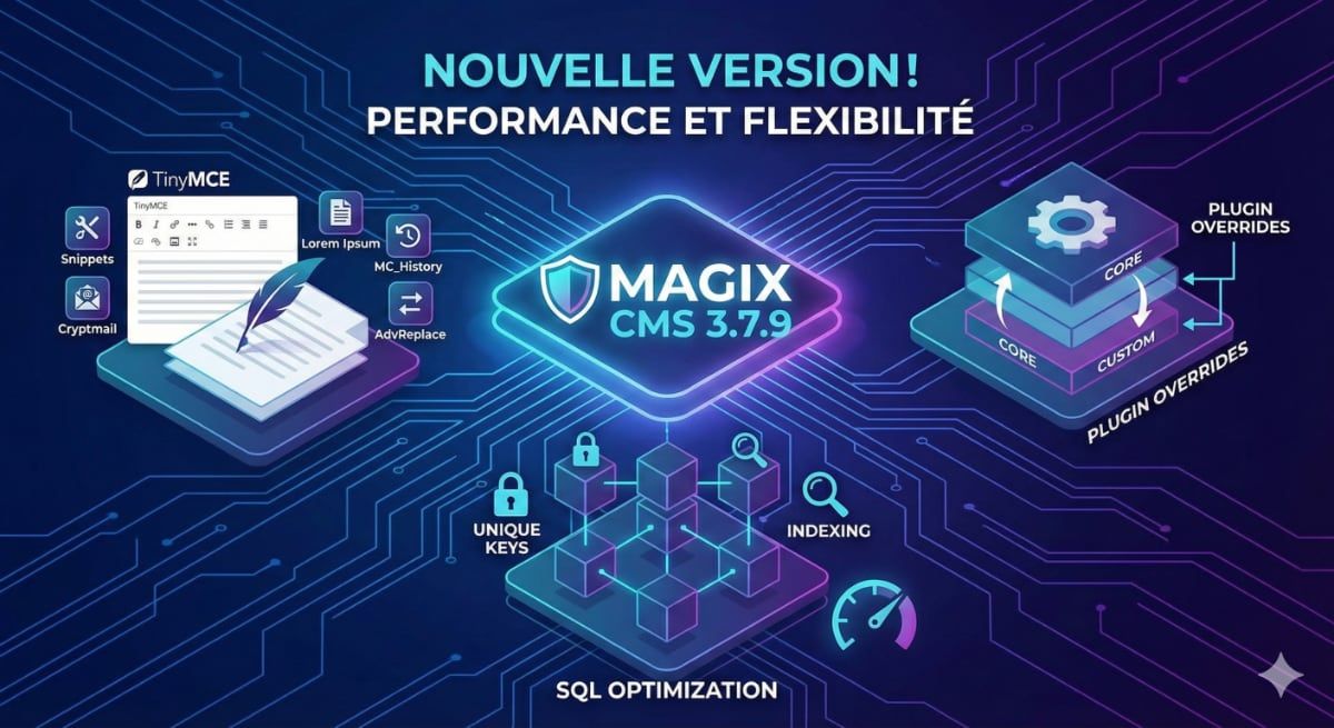 La version 3.7.9 de Magix CMS est officiellement disponible ! Conçue pour offrir aux développeurs un environnement de travail plus performant et plus flexible, cette mouture se concentre sur l'optimisation structurelle et l'enrichissement de l'expérience d'édition dès l'installation.