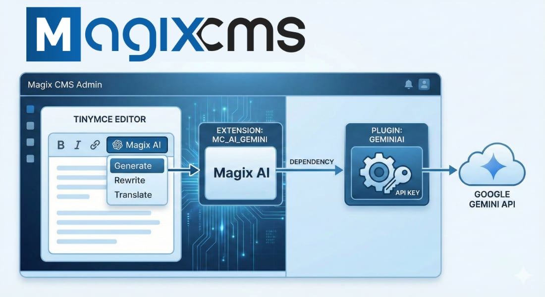 Le plugin geminiai : Il s'agit du socle technique indispensable. Ce plugin Magix CMS assure la communication sécurisée avec l'API Gemini de Google. Il centralise la configuration, notamment la gestion de la clé API et le choix des modèles de langage.