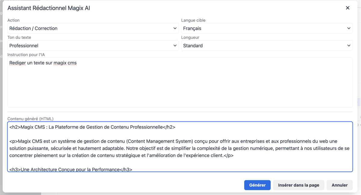 L'écosystème Magix CMS évolue pour intégrer les dernières avancées en matière d'intelligence artificielle générative. Avec Magix AI, les rédacteurs disposent désormais d'un assistant intelligent directement intégré à leur interface de travail habituelle pour faciliter la création et l'optimisation de leurs contenus textuels.
