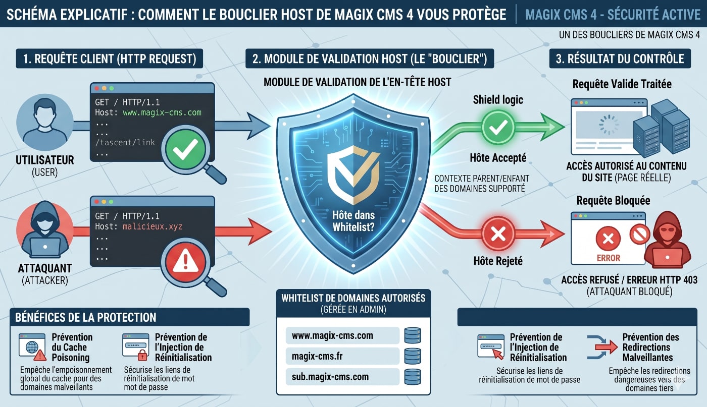 La performance a toujours été l'un des piliers de Magix CMS, mais la rapidité ne doit jamais se faire au détriment de l'intégrité. Avec l'évolution des menaces web en 2026, la version 4 franchit un cap majeur en intégrant nativement la Host Header Validation.