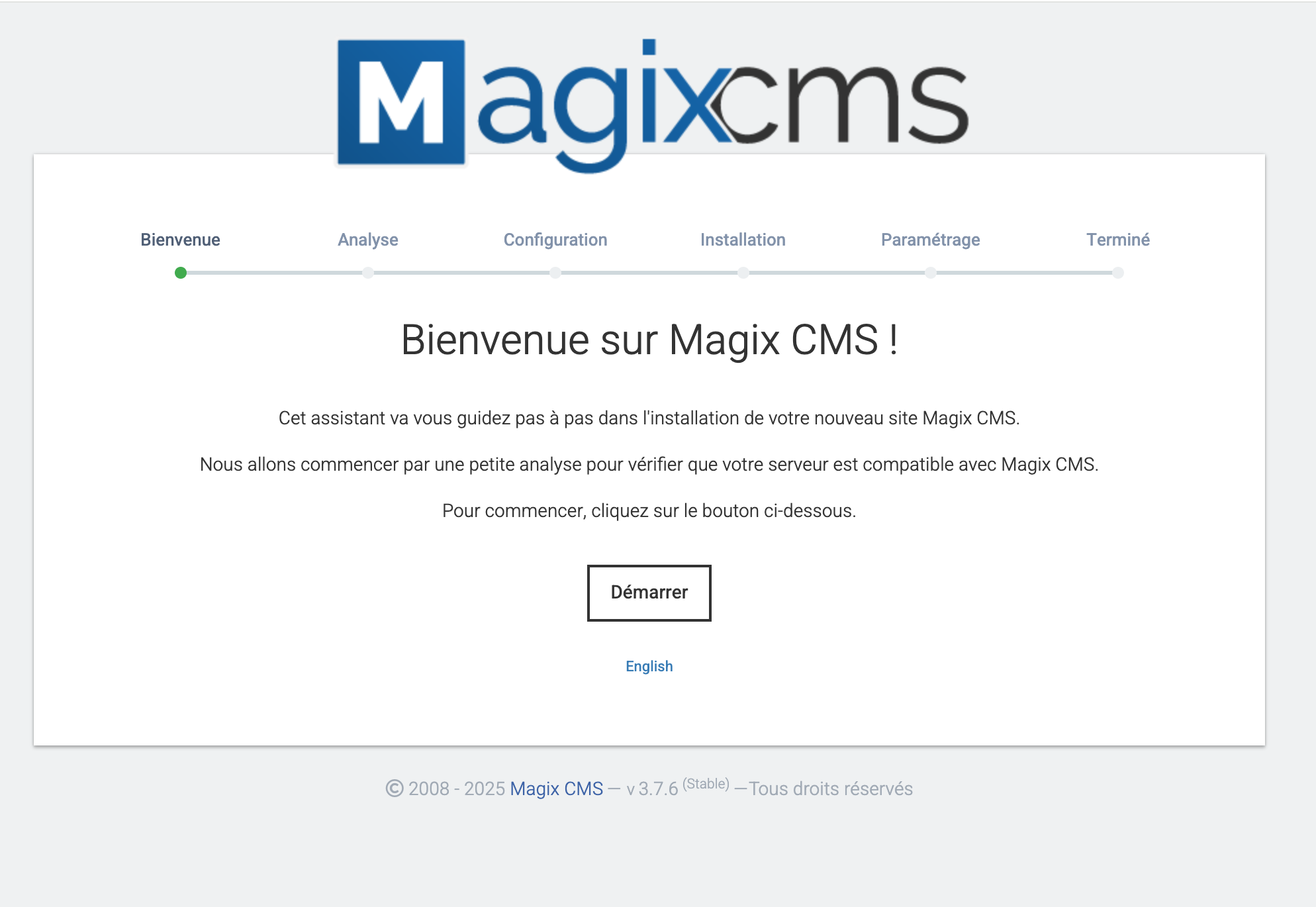Lorsque votre serveur est prêt à recevoir Magix CMS, vous pouvez vous rendre sur votre page d’accueil et un message vous invitera à commencer l’Installation de Magix CMS.