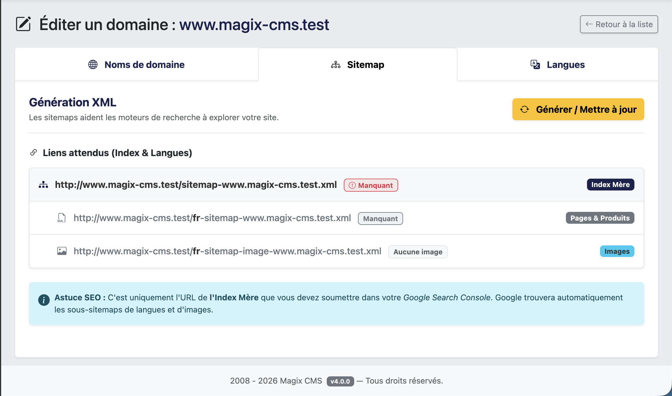 Le système de Sitemap de Magix CMS 4 est entièrement automatisé. Il génère un plan de site XML normé que les robots (Googlebot, Bingbot) consultent pour indexer vos pages plus rapidement.