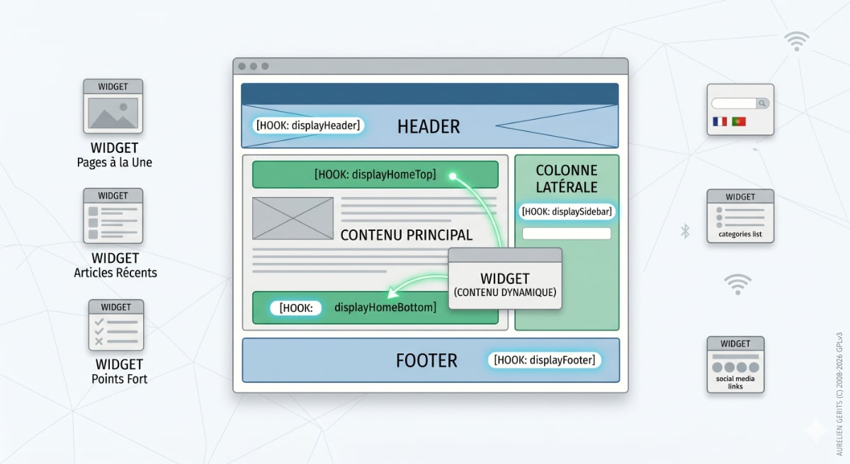 Hook (Zone) : Un emplacement prédéfini dans votre thème (ex: haut de page, colonne gauche, pied de page) capable de recevoir un ou plusieurs widgets.