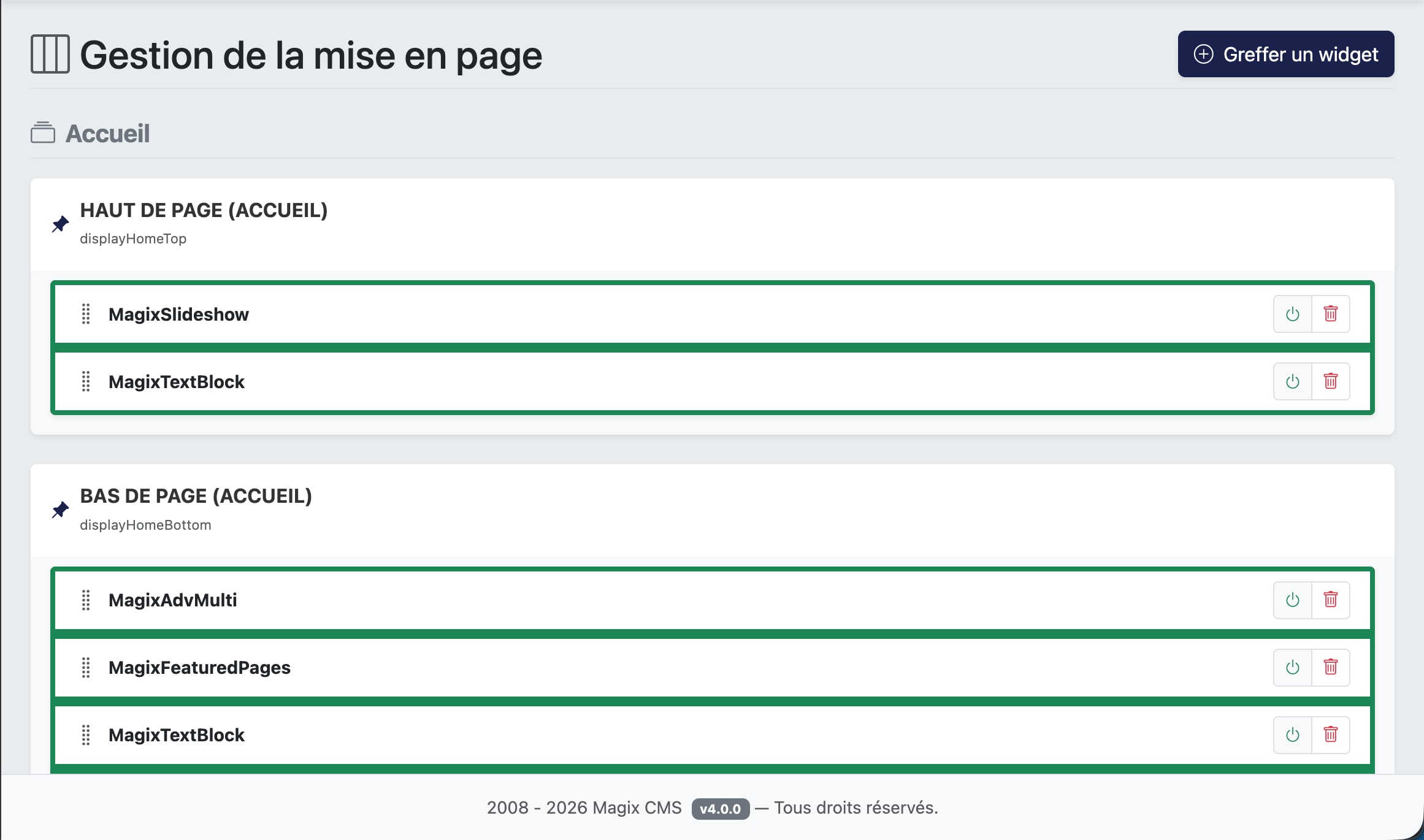 Activation / Désactivation : Le bouton "Power" permet de masquer un widget instantanément sur le site public tout en conservant sa configuration.